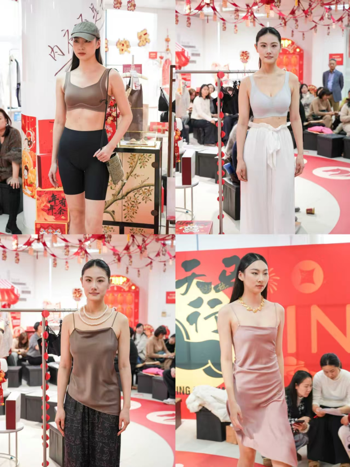 其中,两大重点系列备受关注:「丝语系列」定位轻奢与非遗传承,以“东方美学,文化升维”为理念,将非遗技艺融入设计,重塑东方舒适美学;「轻氧系列」主打“科技织就,轻盈新生”,采用AIR羽三明治黑科技面料,以极致轻盈、透气速干等特性,满足多场景穿着需求。